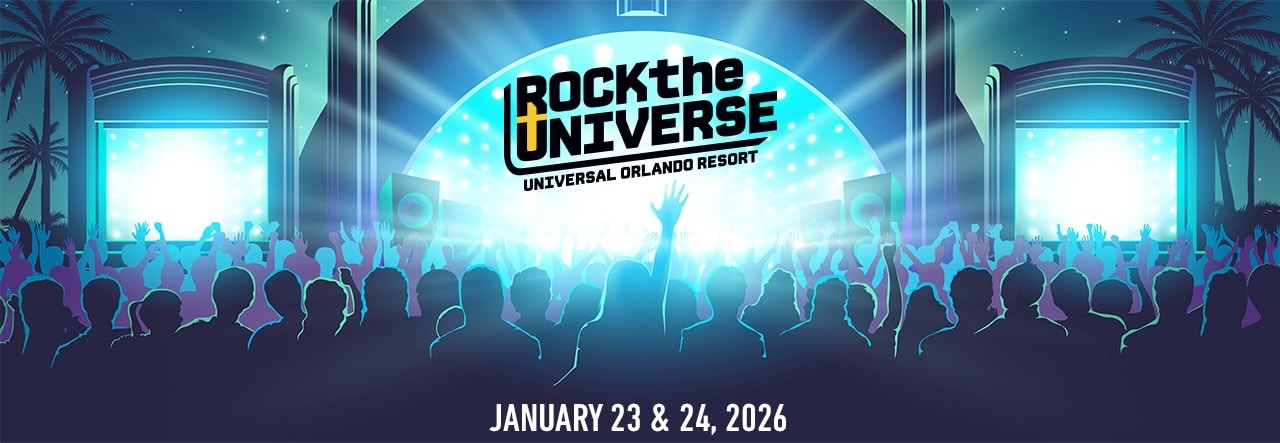 ℹ️ Rock the Universe is a separately ticketed special event held on two specific dates. Event occurs rain or shine. No rain checks, returns or refunds. Prices, times, dates, entertainment, event and/or experience details are subject to changes and/or cancellation without notice. Parking fees are not included. General theme park admission tickets including, but not limited to, Annual Passes and Complimentary passes are not valid for this event. Additional restrictions may apply. Cabana Bay Beach Resort TM & © 2026 UCF Hotel Venture II. Universal elements and all related indicia TM & © 2026 Universal Studios. All rights reserved.